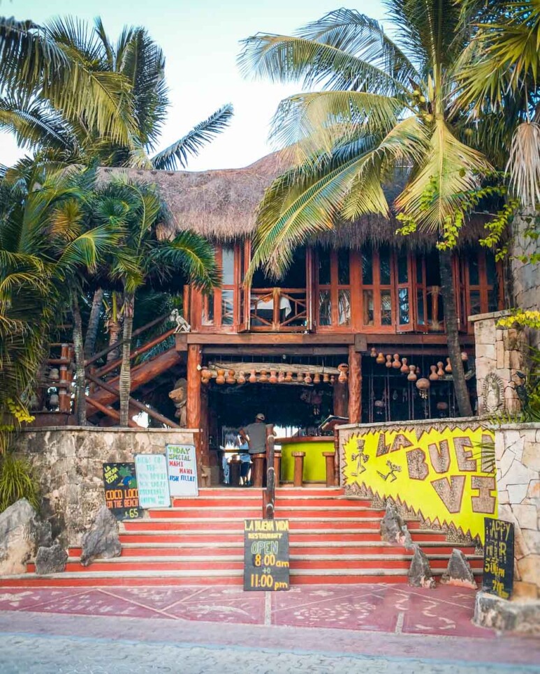 A favorite restaurant in Akumal is La Buena Vida. Their fish dishes and coco locos are amazing. The restaurant has swings and hammocks and the tables are placed in the sand.